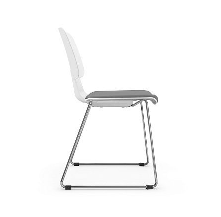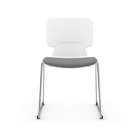 Кресло для посетителей Alex-B на полозьях имеет тканевое сиденье, спинка выполнена из пластика. Каркас выполнен из сплошного металлического прута диаметром 12 мм, цвет — хром, полозья каркаса снабжены четырьмя подпятниками, кресла штабелируются по вертикали.