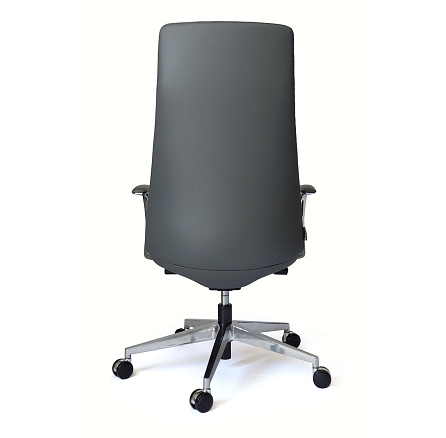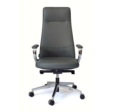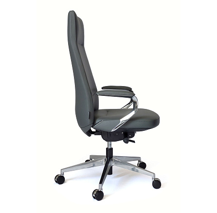 Обивка: лицевая часть — кожа, задняя часть — экокожа. Хромированные металлические подлокотники со вставками из кожи. Асинхронное отклонение спинки и сиденья. Полиамидные (нейлоновые) ролики увеличенного диаметра (60 мм)