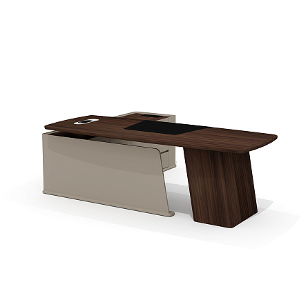 Основу стола составляет вместительная столешница толщиной 41 мм с интегрированным бюваром из экокожи размером 800х600 мм, что создает оптимальное пространство для размещения всей необходимой оргтехники и документов. В левой части столешницы расположен современный розеточный блок со встроенной беспроводной зарядкой Qi Wireless, оснащенный двумя силовыми и двумя USB-портами. Специальная сдвижная панель защищает разъемы от пыли, а продуманная система кабель-менеджмента позволяет аккуратно спрятать провода в тумбу.