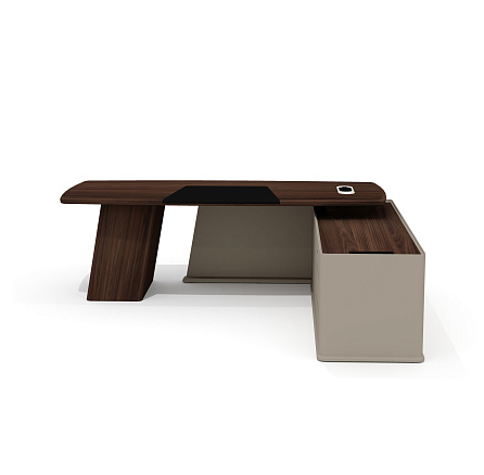 Опорная тумба стола разделена на три функциональных отделения: справа находятся три выдвижных ящика на шариковых направляющих с механизмом плавного закрывания, в центре — ниша с распашной дверцей, слева — просторное отделение для размещения компьютера и сопутствующего оборудования. Верхний ящик защищен биометрическим замком, обеспечивающим надежную сохранность важных документов. Все фасады оснащены удобными выступами для открывания, а утопленный топ тумбы защищает расположенные на нем предметы от падения.