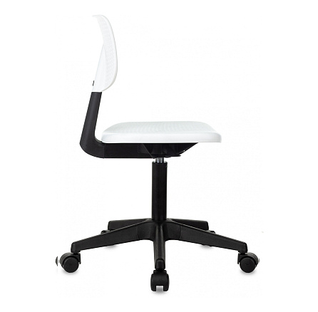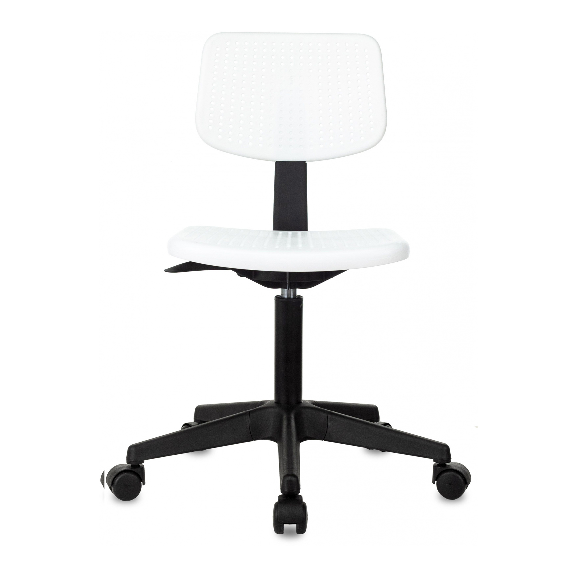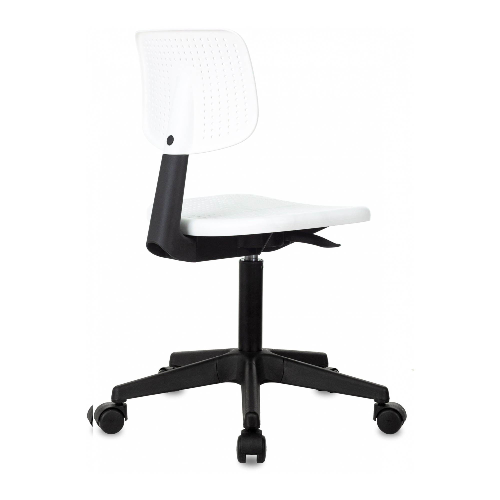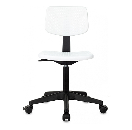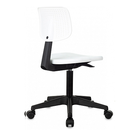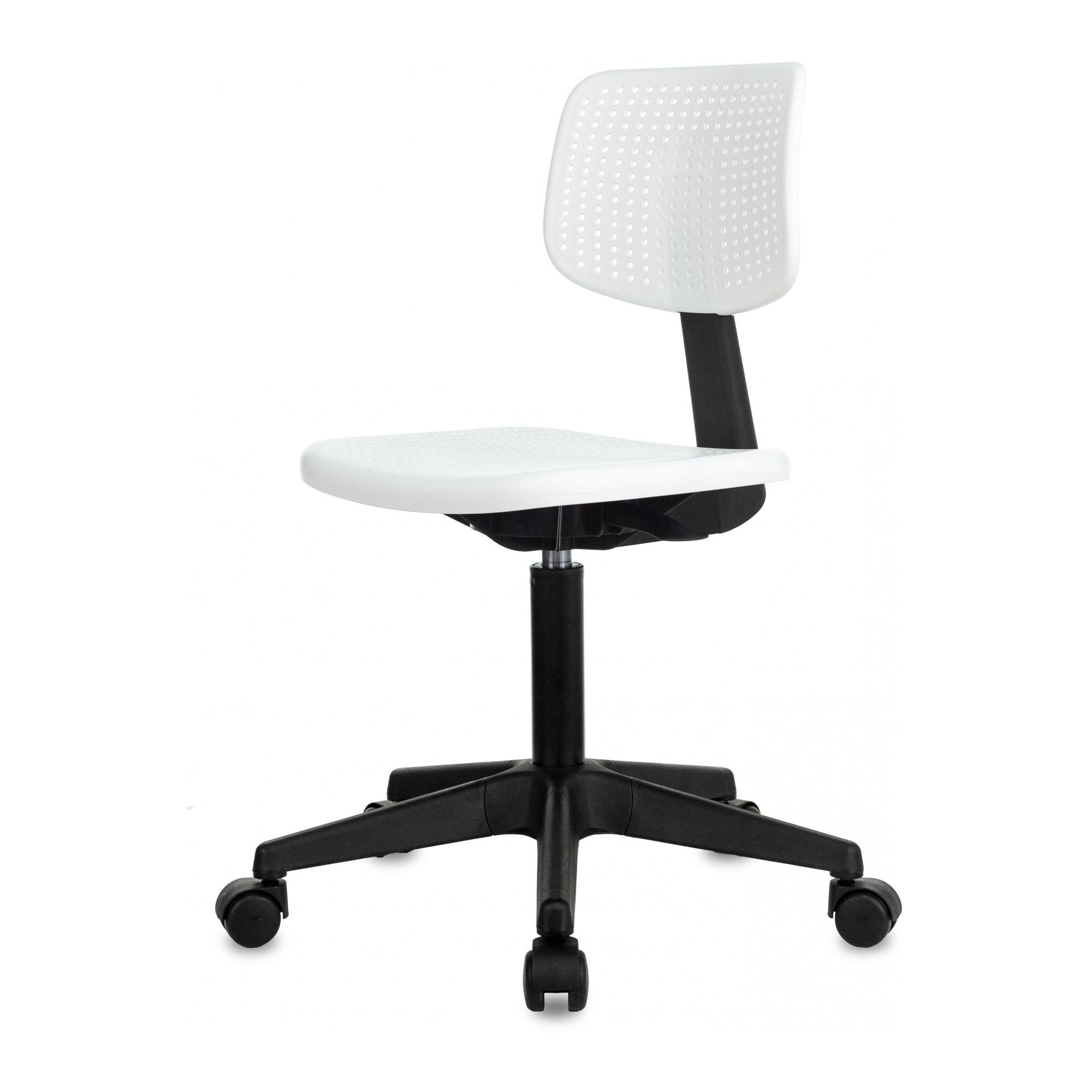 Cпинка и сиденье из белого пластика с перфорацией. Сборная пластиковая крестовина.Соответствует стандарту BIFMA.