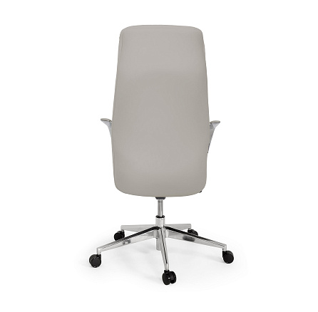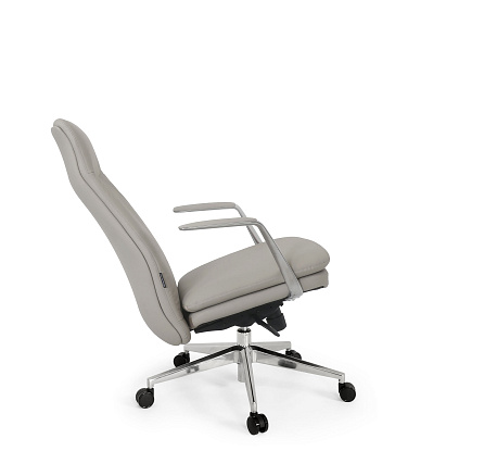 Обивка комбинированной модели: лицевая часть — кожа, задняя часть — экокожа. Асинхронное отклонение спинки и сиденья. Хромированные металлические подлокотники со вставками из экокожи. Прорезиненные ролики