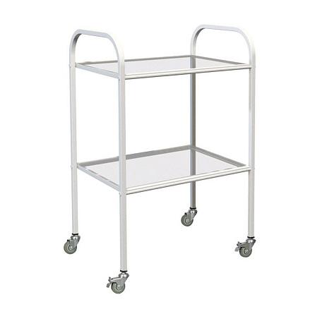 Процедурный стол МД SP 2G со стеклянными полками используется в медицинских учреждениях для размещения инструментов, препаратов и медицинских приборов.