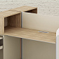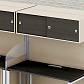 • Мебель выполнена из ЛДСП, облицованной меламиновыми пленками. Перегородки выполнены из алюминиевого профиля и панелей из ЛДСП, облицованных меламиновыми пленками. Торцы деталей обработаны кромочной лентой ПВХ толщиной 2 мм и 0,5 мм. Декоративные перегородки выполнены из акрила молочного цвета толщиной 4 мм.