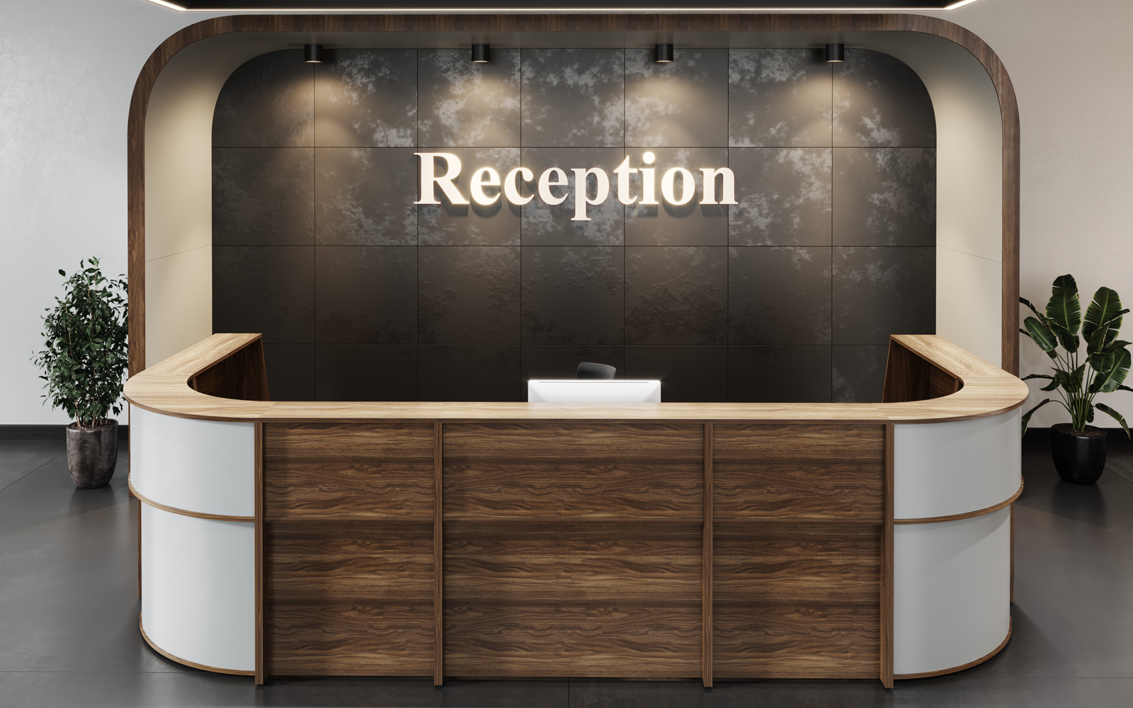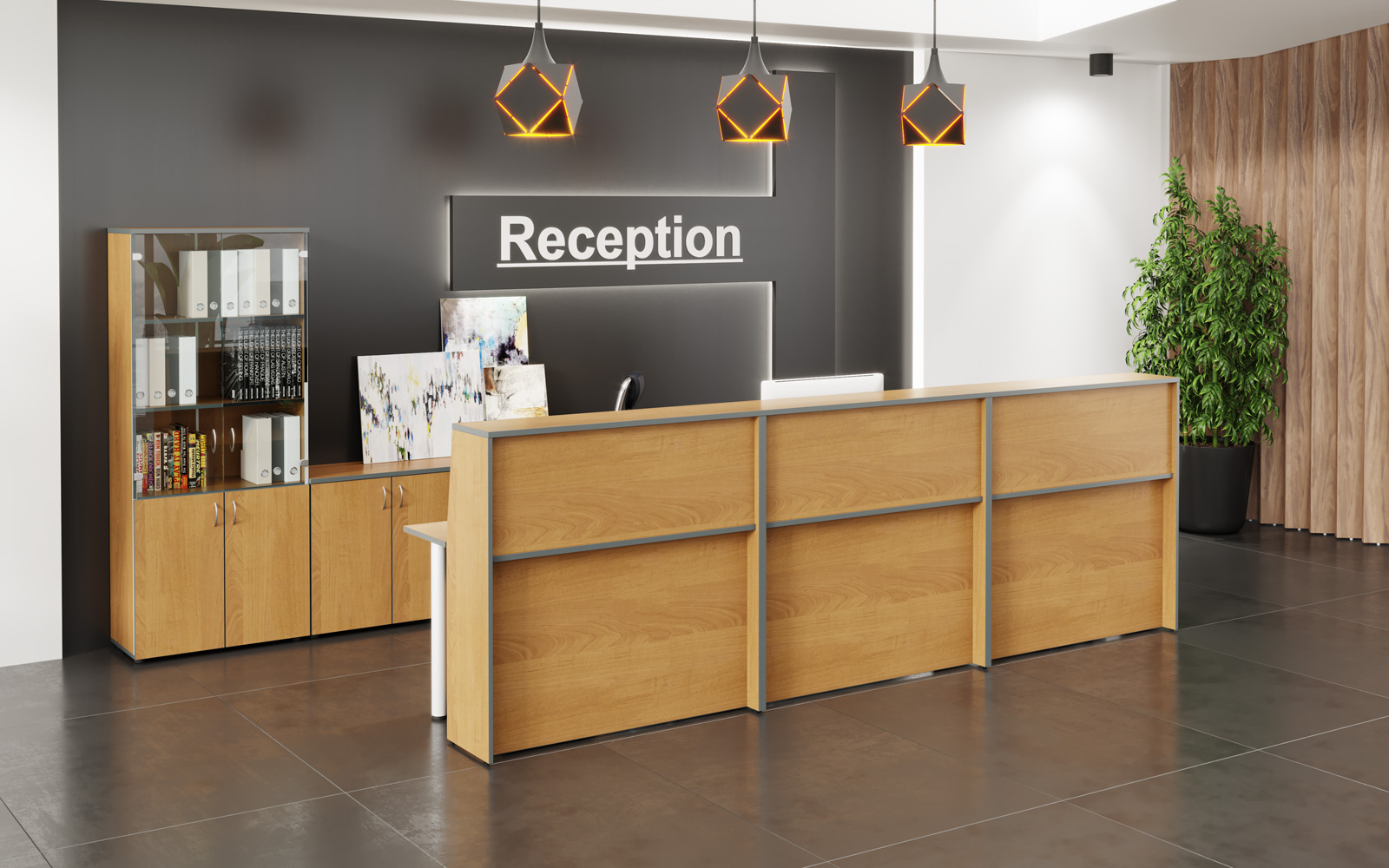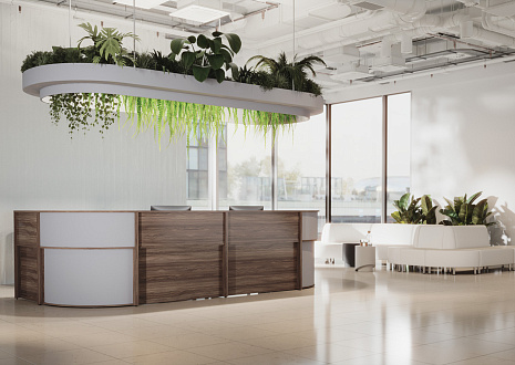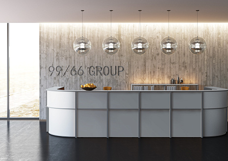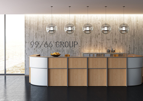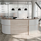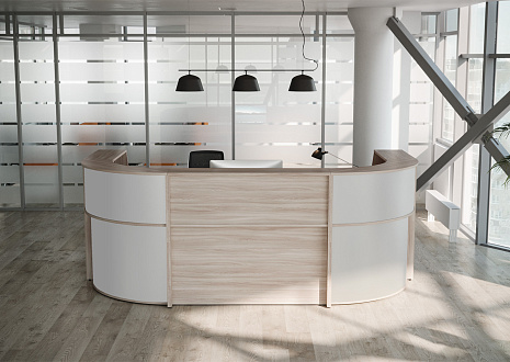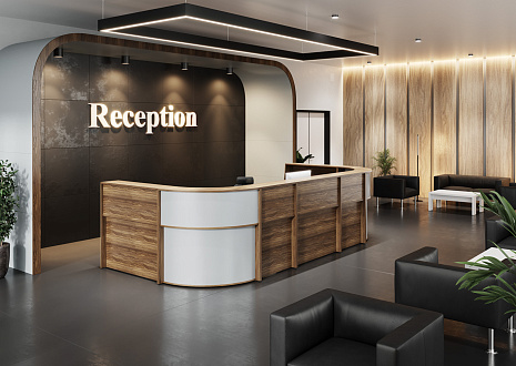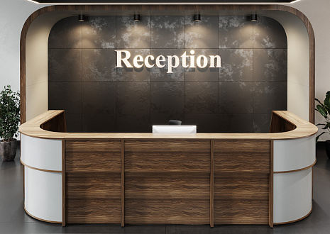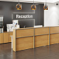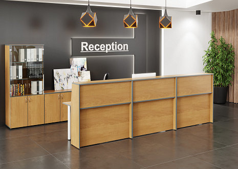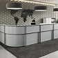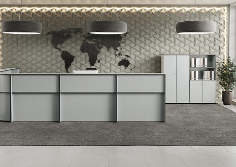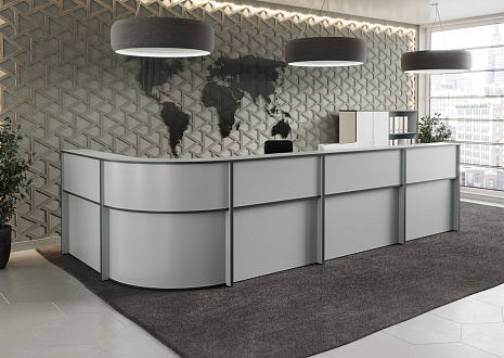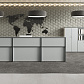 - Передние панели в угловых сегментах стойки администратора выполнены из HDF толщиной 3 мм, запрессованной в ПВХ-пленку цвета «серый металлик».