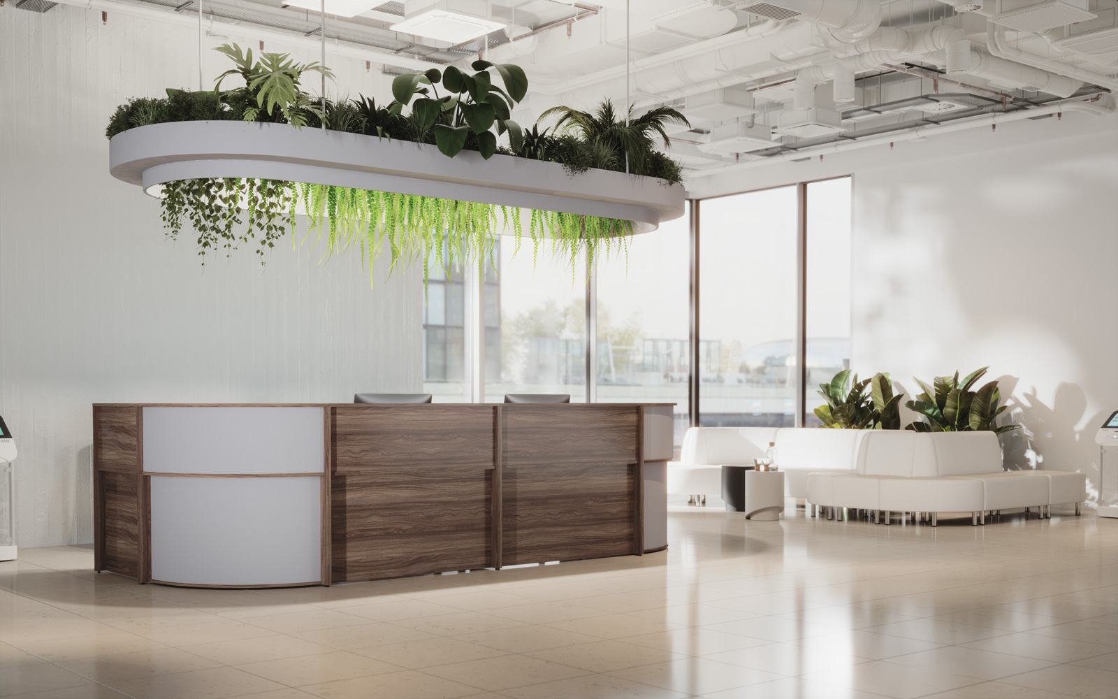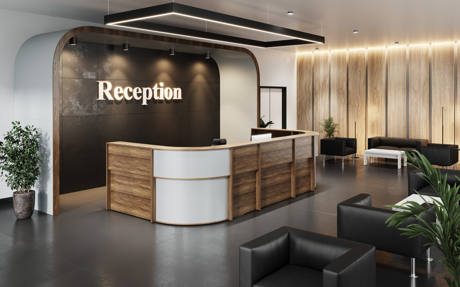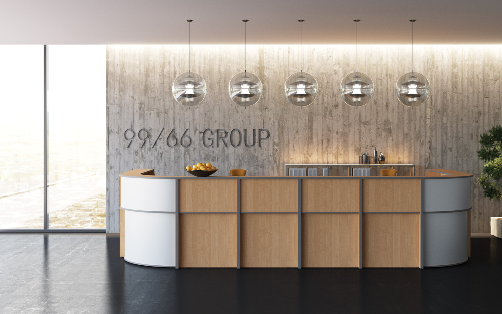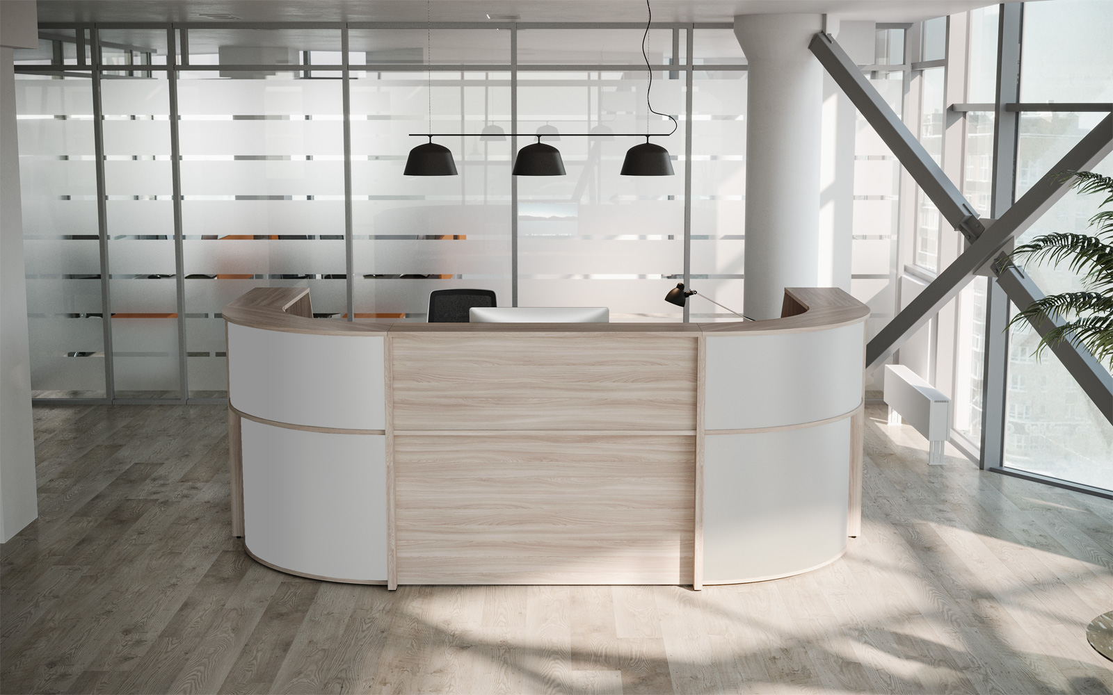 - Передние панели в угловых сегментах стойки администратора выполнены из HDF толщиной 3 мм, запрессованной в ПВХ-пленку цвета «серый металлик».