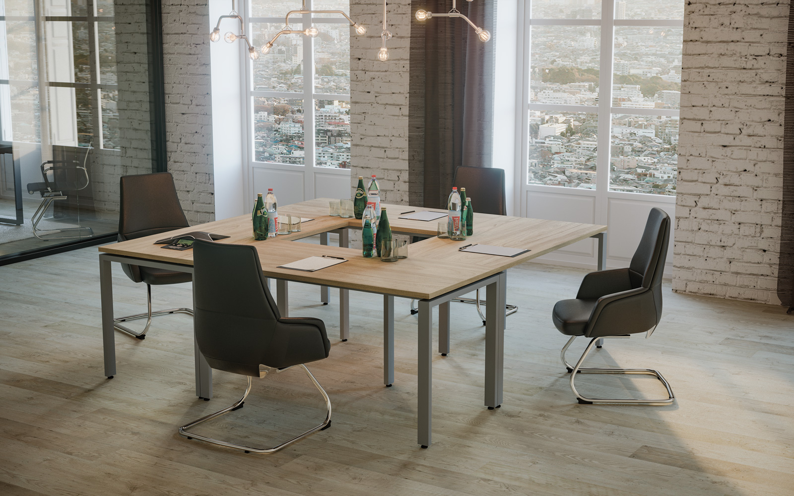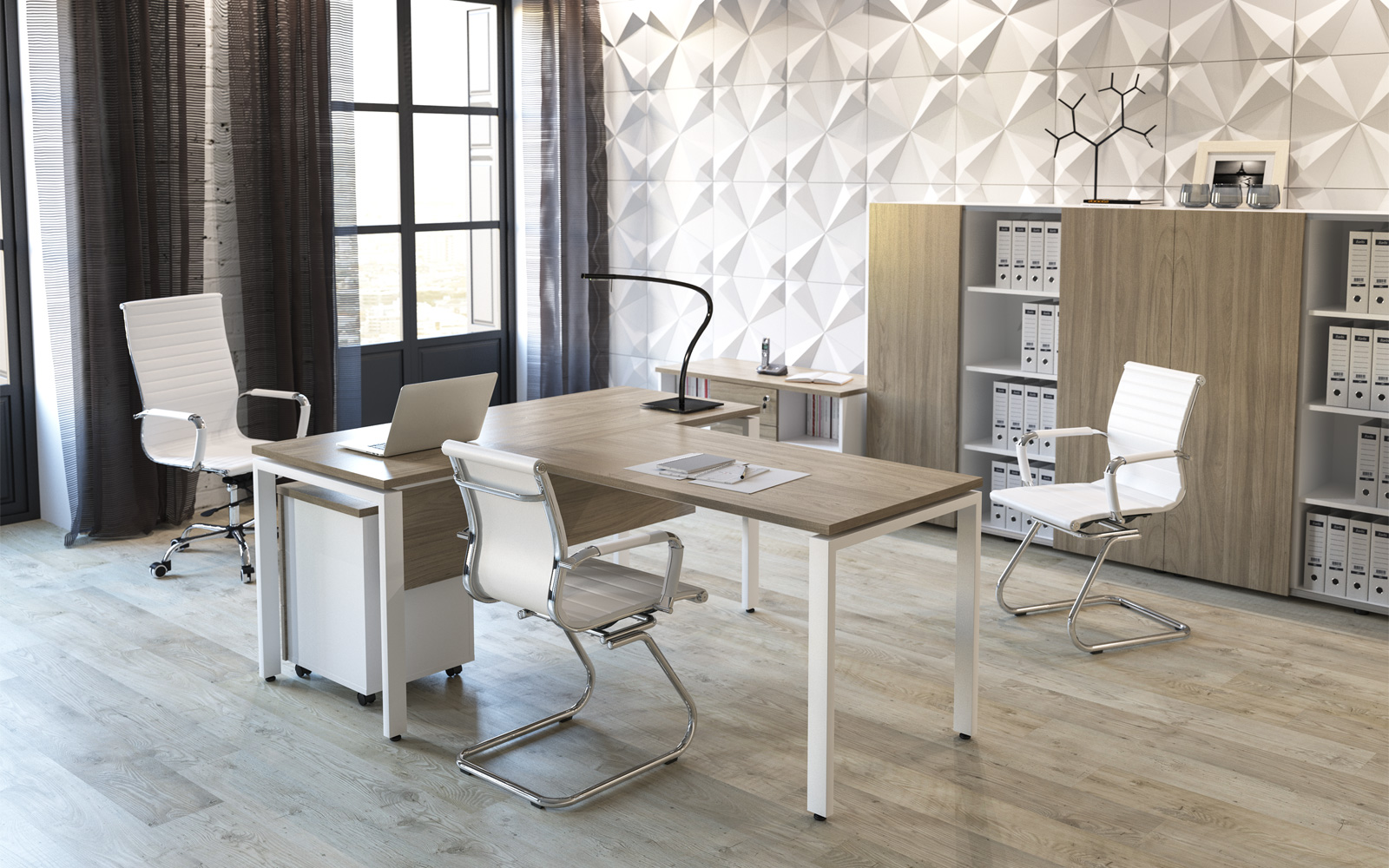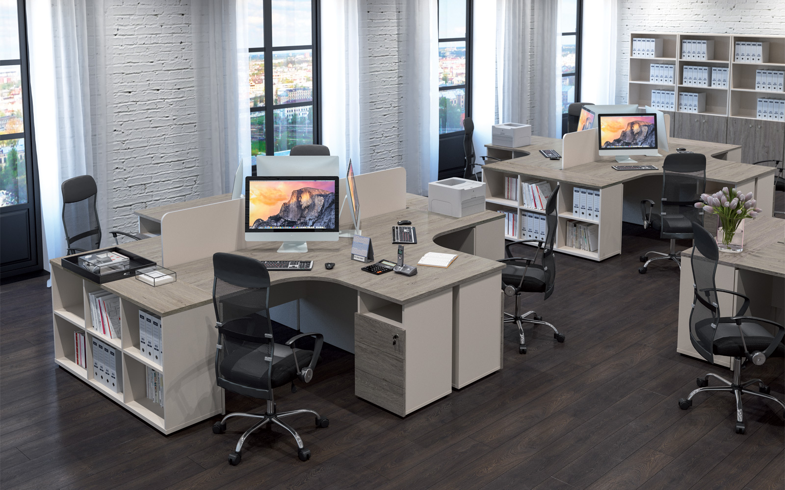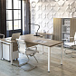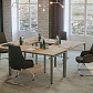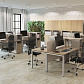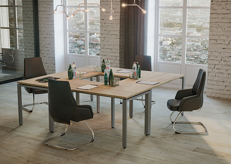 - В собранных рабочих столах расстояние между опорой и столешницей составляет 15 мм — такое дизайнерское решение визуально облегчает всю конструкцию.