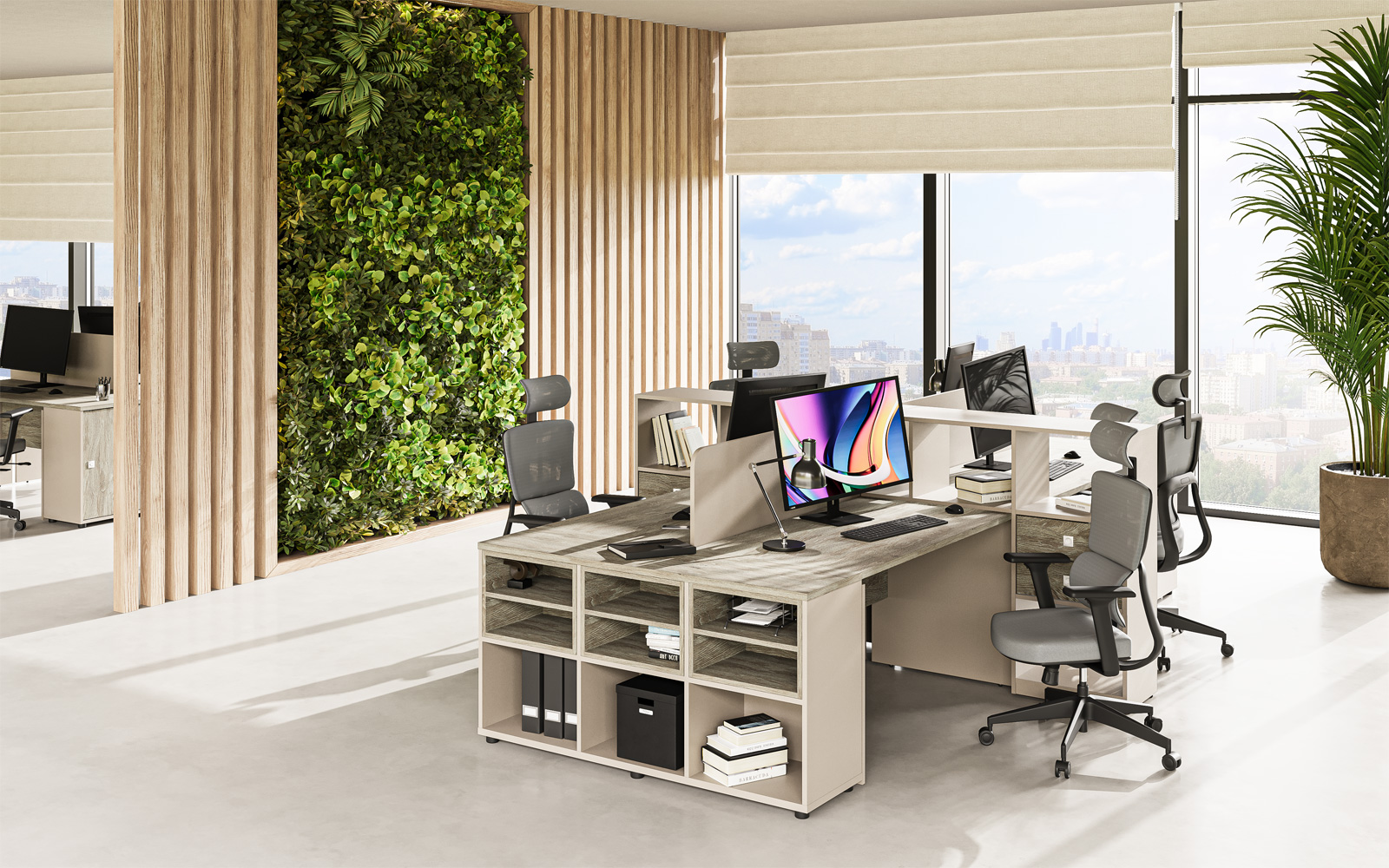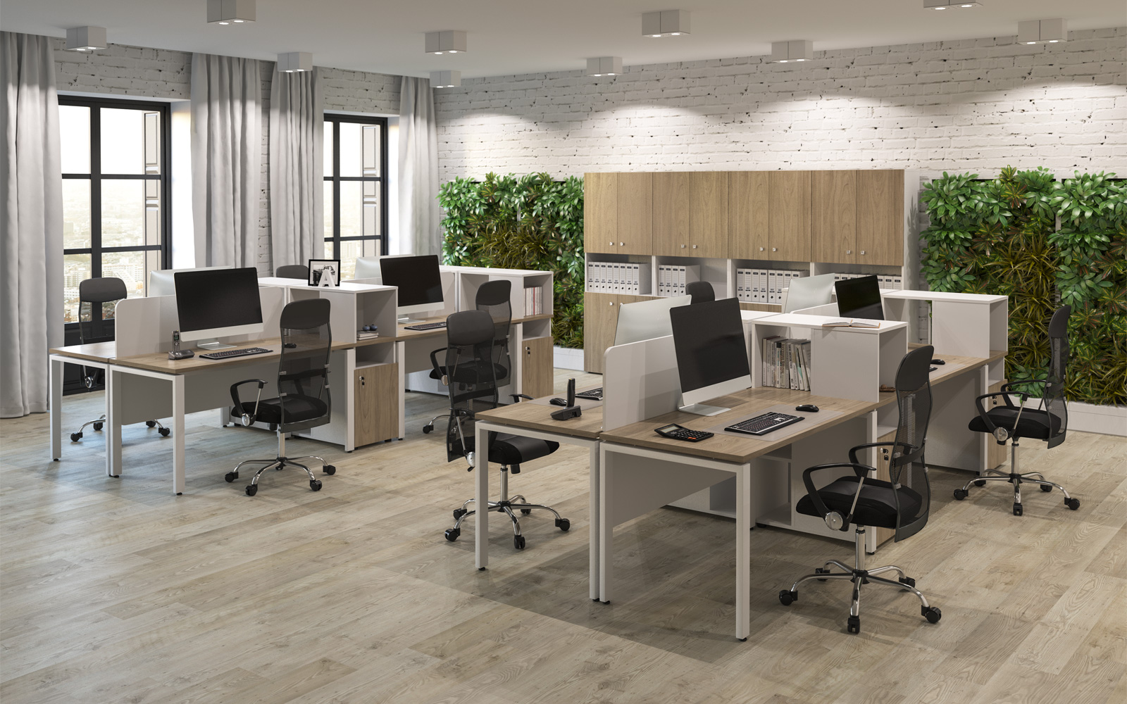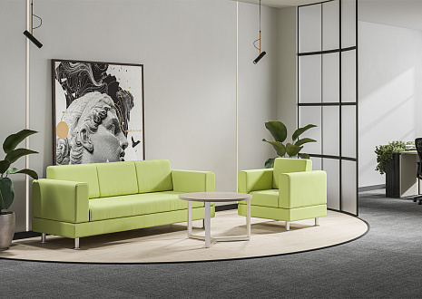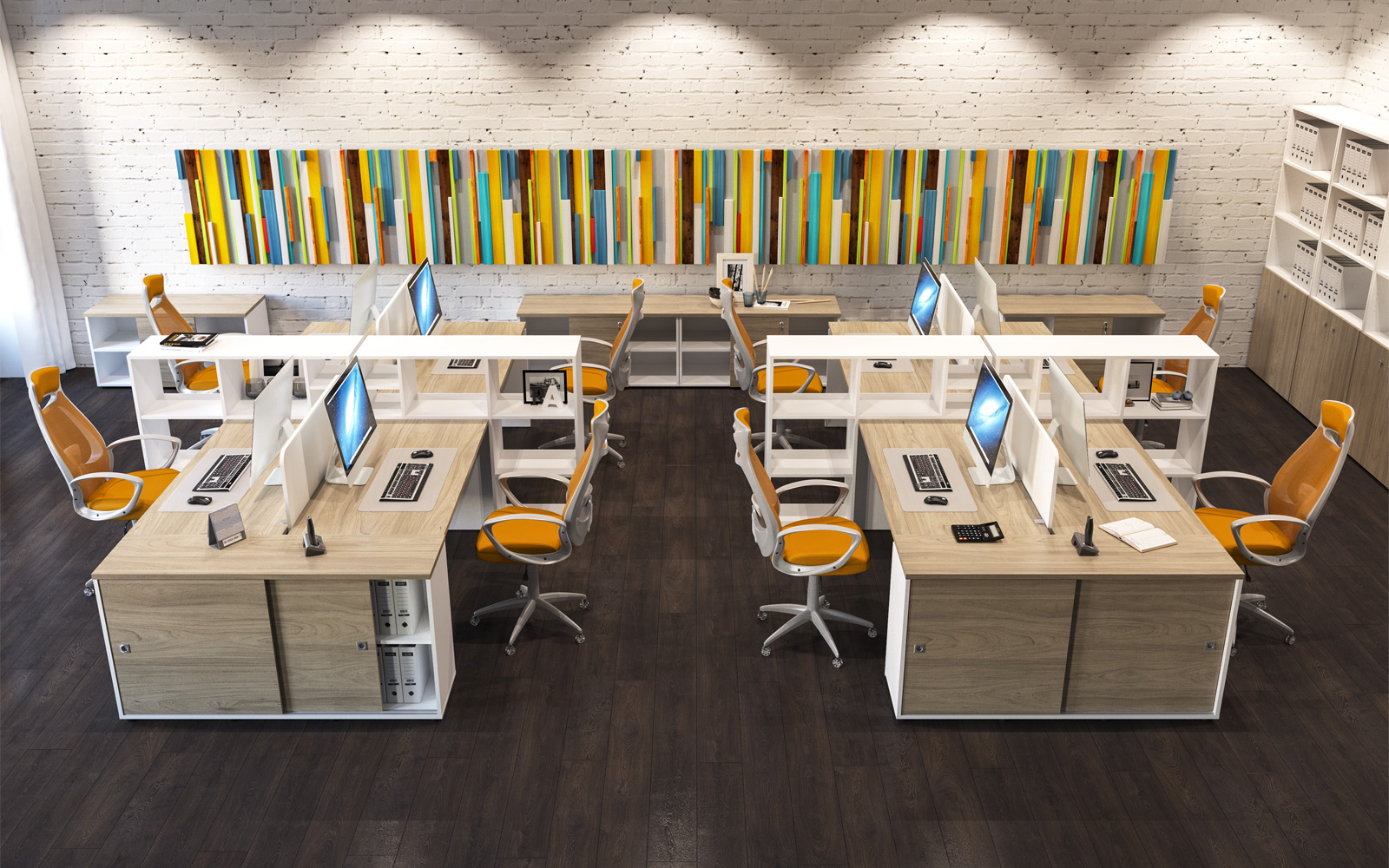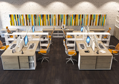 - В дополнительном цвете «зеленый лайм» выпускаются экраны-перегородки (R-60/61/62, R-60.1/61.1/62.1), мобильная тумба (R-31), настольная полка (R-82) и боксы для заполнения стеллажей (R-84/85/86).