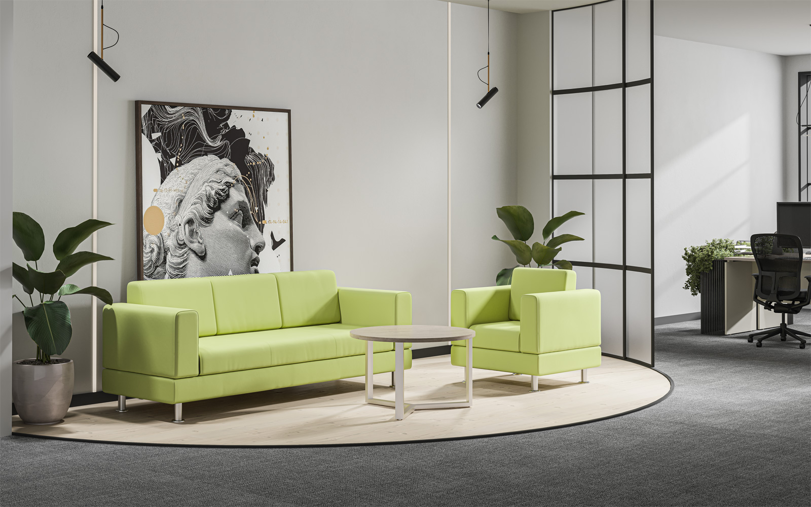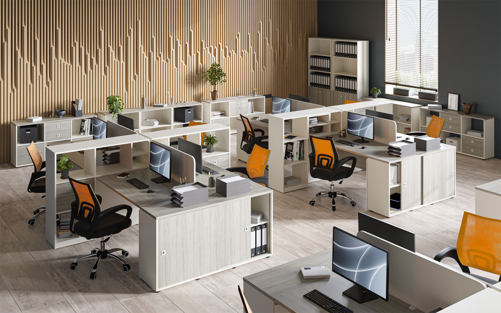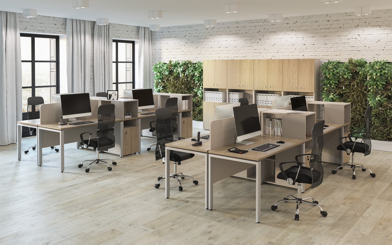 - В дополнительном цвете «зеленый лайм» выпускаются экраны-перегородки (R-60/61/62, R-60.1/61.1/62.1), мобильная тумба (R-31), настольная полка (R-82) и боксы для заполнения стеллажей (R-84/85/86).