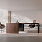 В кабинете Art.Neo II матовые фасады шкафов подчеркивают выраженную текстуру натурального дубового шпона. С каждым из трех древесных цветов получается свое, не похожее на другие, сочетание. Модельный ряд коллекции небольшой, но хорошо продуманный, в нем есть все элементы, необходимые для удобной организации рабочего места руководителя.
