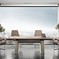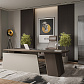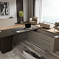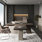 Плавность линий сглаживает математическую точность деталей. А легкость и асимметричность силуэта рабочих столов уравновешена монументальностью опорных тумб.