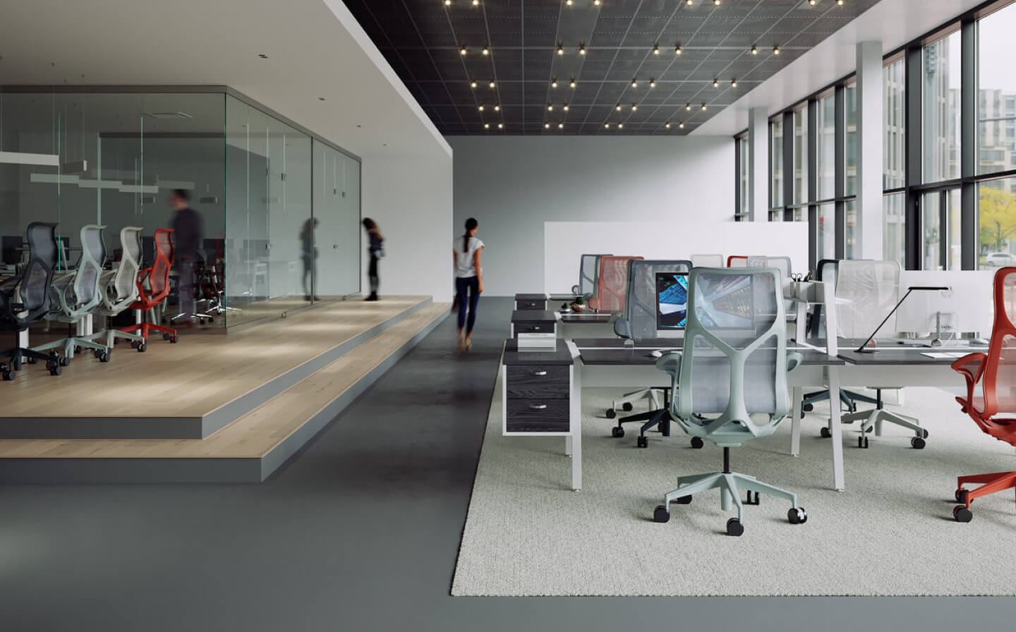 - «Делиос / антрацит» — траверсы столов и брифинг-приставки, лотки рабочих столов, основания опорных тумб, глухие фасады тумб и шкафов выполняются в цвете «антрацит», остальные элементы — в цвете «Делиос»;