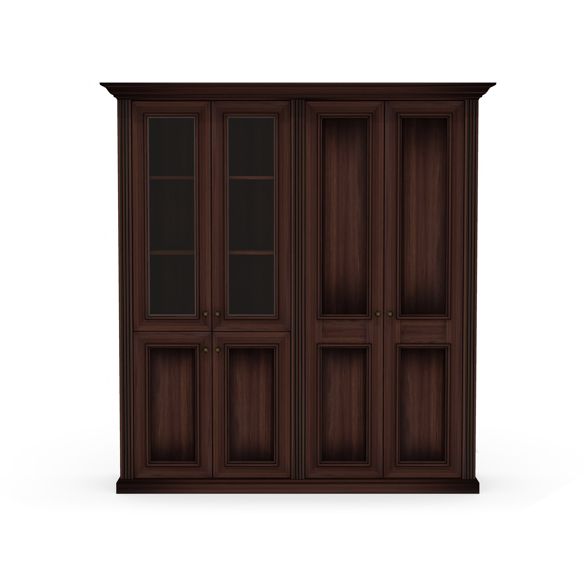 - Стеклянные фасады шкафов выполнены из прозрачного стекла толщиной 4 мм, обрамлённого шпонированной МДФ-рамой с резным молдингом из массива дерева.
