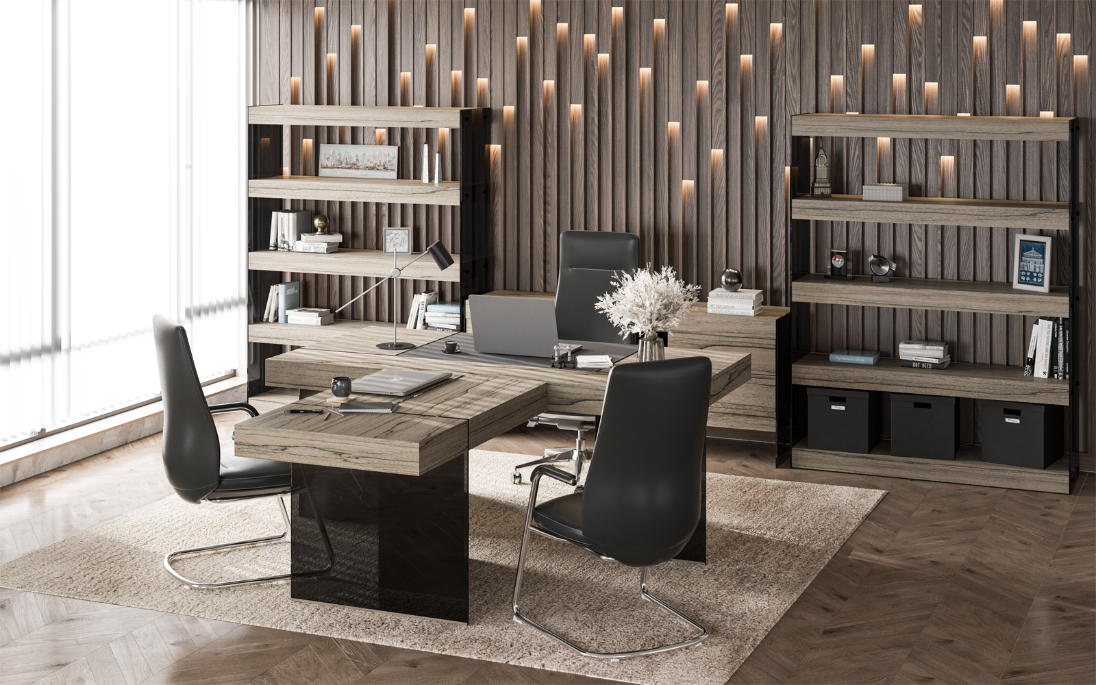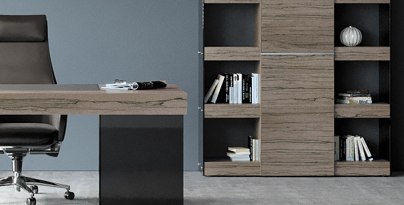 - Нижние панели столов, внутренние полки стеллажей, боковые и задние стенки выдвижных ящиков выполнены из ЛДСП толщиной 16 мм в цвете «антрацит». Торцы деталей обработаны кромочной