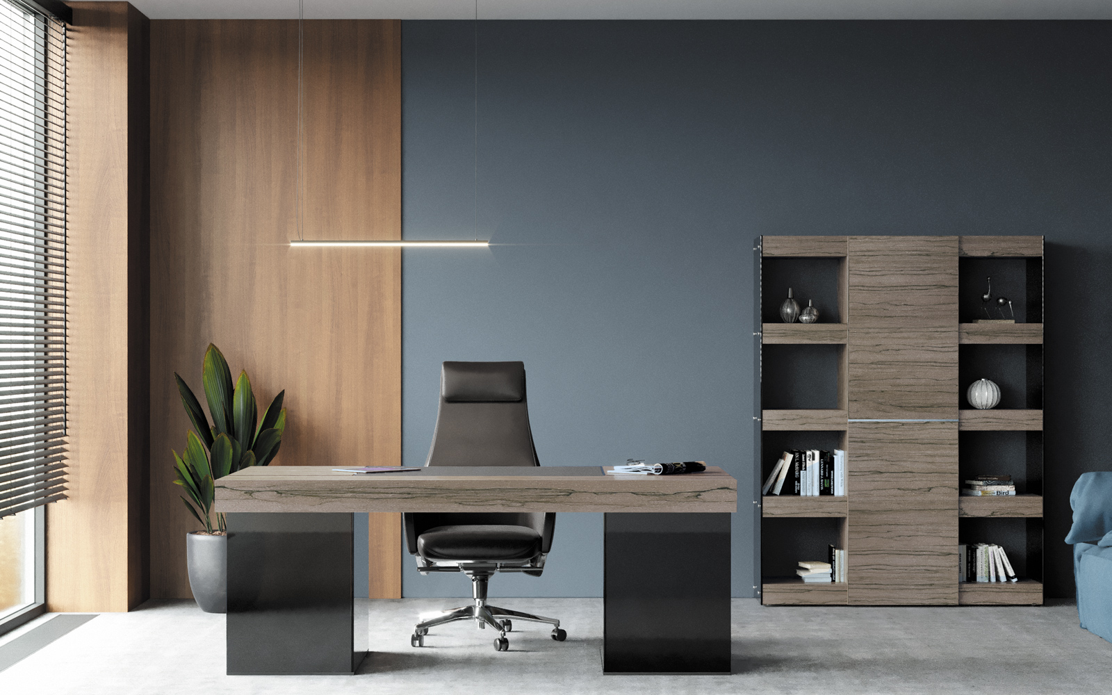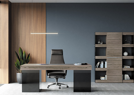 Кабинет руководителя Glass.Go сочетает противоположности: массивные столешницы и прочные легкие полупрозрачные опоры, выраженную древесную текстуру и глянец стеклянных поверхностей, строгость линий отдельных элементов и эффектный вид кабинета.