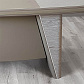 - шпон «дуб серебристый» в сочетании с ЛДСП цвета «мокко» и декоративной обивкой элементов экокожей цвета «стоун». Цвету экокожи соответствует серо-бежевое эмалевое покрытие фрезерованных торцов столешниц, топов, панелей и лотка под канцелярию. Стеклянные полки греденции и фасады шкафов выполнены из матового стекла;
