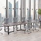 • О-образные опоры, выполненные из полированной до зеркального блеска нержавеющей трубы прямоугольного сечения 60х30 мм и соединенные парой металлических траверсов из трубы 30х30 мм с черным матовым полимерным покрытием. При этом в собранных рабочих столах и приставках расстояние между опорой и столешницей составляет 10 мм.