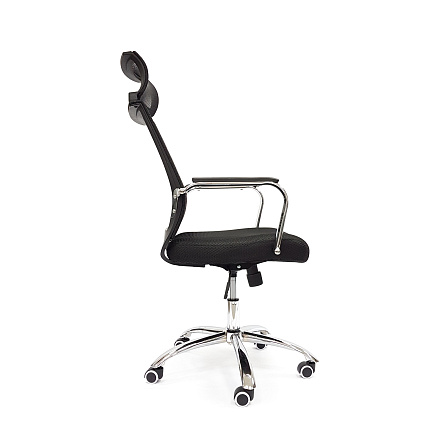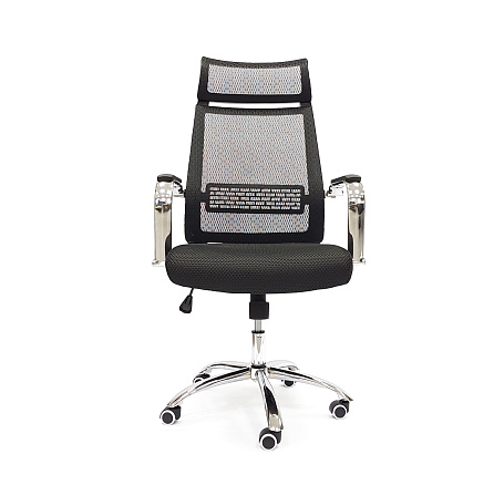 Обивка: спинка и подголовник — сетка, сиденье — ткань. Хромированные металлические подлокотники с накладками из черного пластика. Спинка с регулируемым по высоте поясничным упором. Прорезиненные ролики