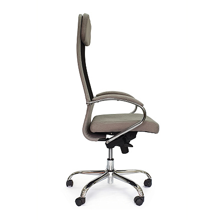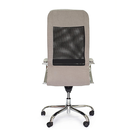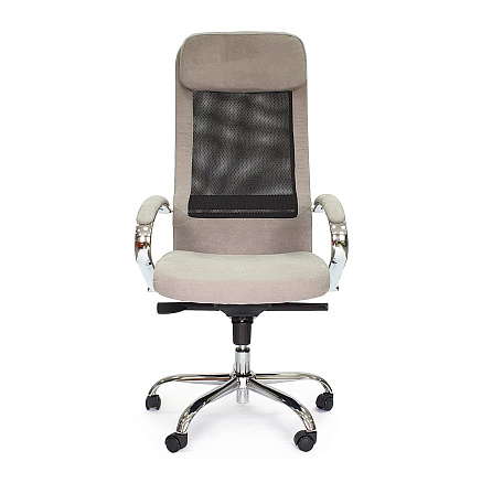 Кресло для руководителя RT-2032 — кресло с тканевой обивкой, широким подголовником и оригинальной вставкой из сетчатой ткани на спинке. Подлокотники — из хромированного металла с мягкими тканевыми накладками. Регулировка высоты и наклона.