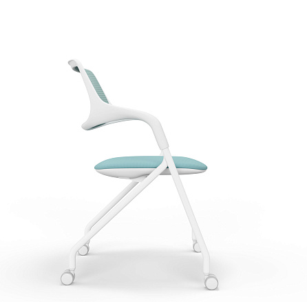 Кресло для посетителей VELA.A – стильное легкое кресло со спинкой из сетчатой ткани и мягким сиденьем с тканевой обивкой. Каркас выполнен из металлической трубы диаметром 25 мм. Модель снабжена прорезиненными роликами, его можно легко перемещать по кабинету. Подлокотники необычной формы объединены со спинкой и сиденьем.