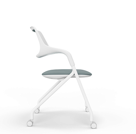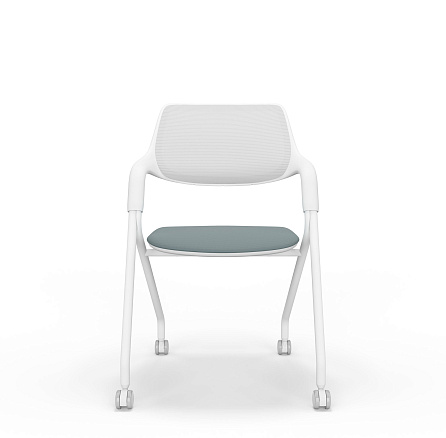 Кресло оборудовано сиденьем с шарнирным механизмом складывания. Со сложенным сиденьем кресла можно штабелировать по горизонтали.