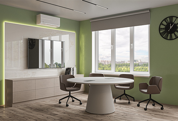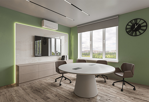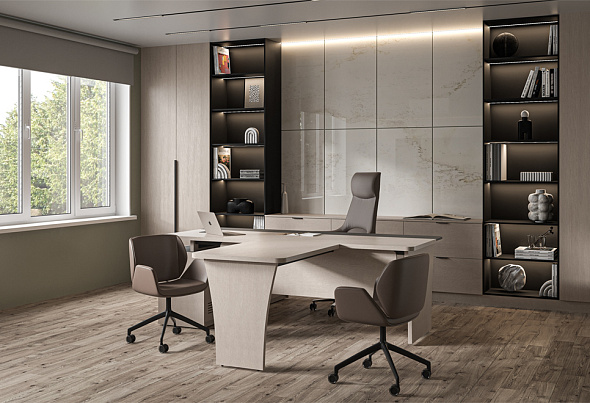 Специалисты «МебельСтиль» разработали мебель для рабочего места руководителя и переговорной зоны. Одна из особенностей кабинета — стеллажи с подсветкой и шкафы для хранения документов во всю высоту помещения. Интерьер дополнен офисными креслами бренда «МебельСтиль».