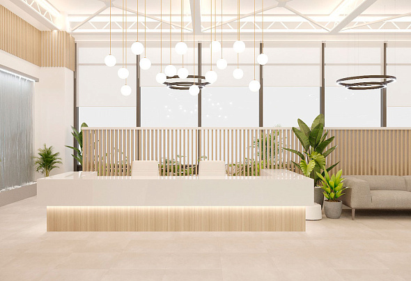Для зоны ресепшен изготовили стойку из ЛДСП с большой накладкой из искусственного белого камня. За стойкой сделали декоративное зонирование в виде заборчика с накладкой из искусственного камня. Дополнили зону ресепшен круглыми креслами для отдыха, цветными пуфами и журнальными столиками разных диаметров и высот производства «МебельСтиль».