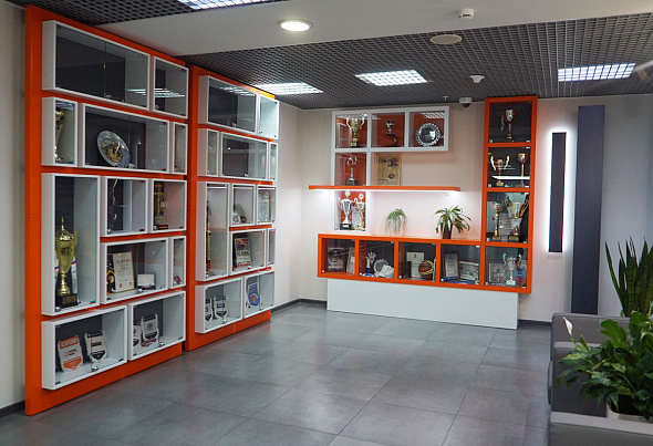 Для зоны ресепшен изготовили стеллажи для спортивных наград из МДФ и ЛДСП с подсветкой, окрашенными в корпоративный цвет компании.