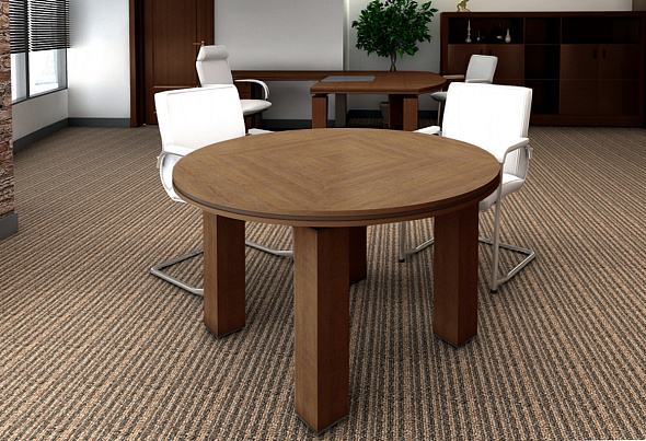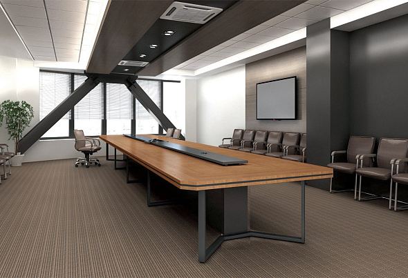 Конференц-стол нестандартной длины — 8 метров — с оригинальной центральной вставкой позволяет комфортно разместить за ним 16-18 человек.