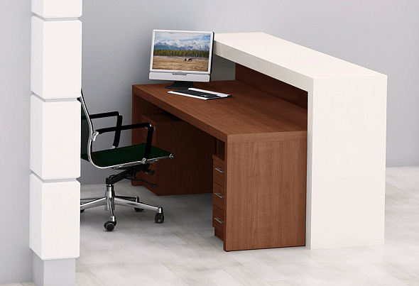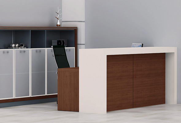 При оборудовании офиса банка были реализованы сразу несколько нестандартных решений: стойка ресепшен и стол переговоров для конференц-зоны.