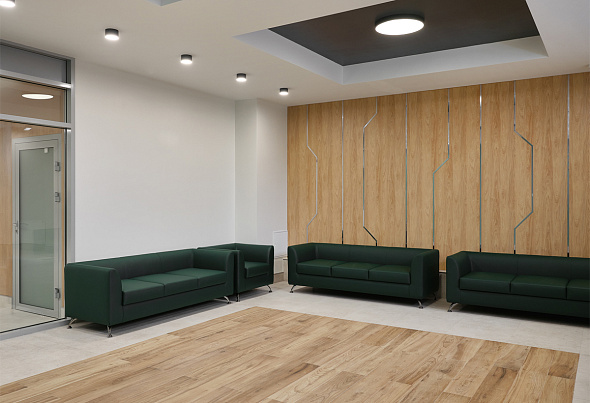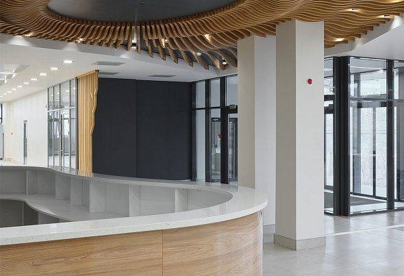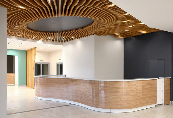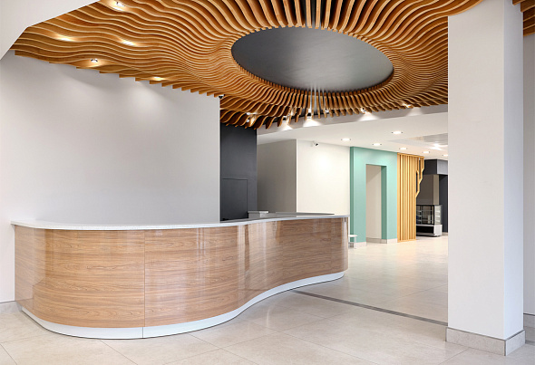 Главным элементом проекта стала стойка ресепшен необычной формы с покрытием из HPL-пластика, столешницей из искусственного камня и подсветкой.