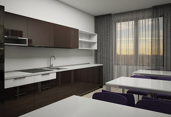 Офисная кухня оснащена мебелью, которая отличается минималистичным дизайном с фасадами из глянца.
