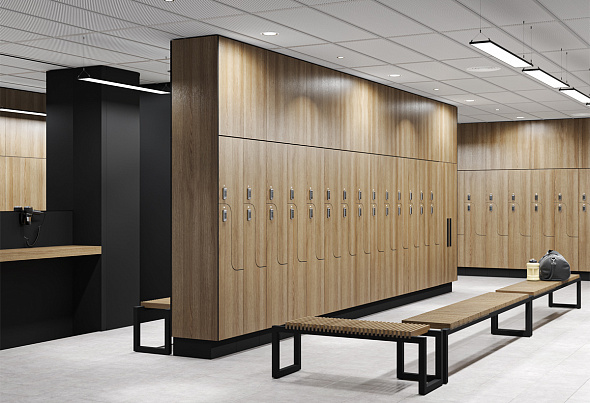 Для этого проекта специалисты «МебельСтиль» разработали шкафы для раздевалок с дверцами необычной формы и электронными замками, а также консольные столешницы для зоны сушки волос.